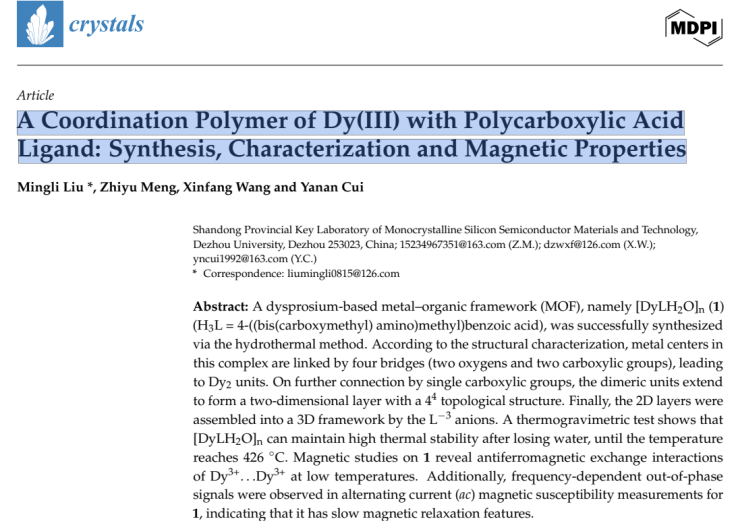 近日,我校国产日韩欧美小视频教师刘明丽副教授作为第一作者,以德州学院为第一完成单位在SCI期刊《Crystals》(中科院三区)发表题为“A Coordination Polymer of Dy(III) with Polycarboxylic Acid Ligand: Synthesis, Characterization and Magnetic Properties”的学术成果。