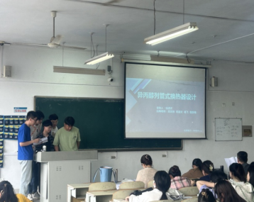 实习期间,在王芳、王爱丽、商书波、刘文博和杨飞等老师的组织和指导下,2021级环境工程专业同学针对冷凝器进行了课程设计,课程设计过程中学生通过查阅资料了解冷凝器的工作原理,并且进行冷凝器选型的设计计算,绘制冷凝器结构图,课程设计完成后组织了答辩(图2),帮助学生解决课程设计过程中遇到的问题,同时对同学们的课程设计成果进行检查。