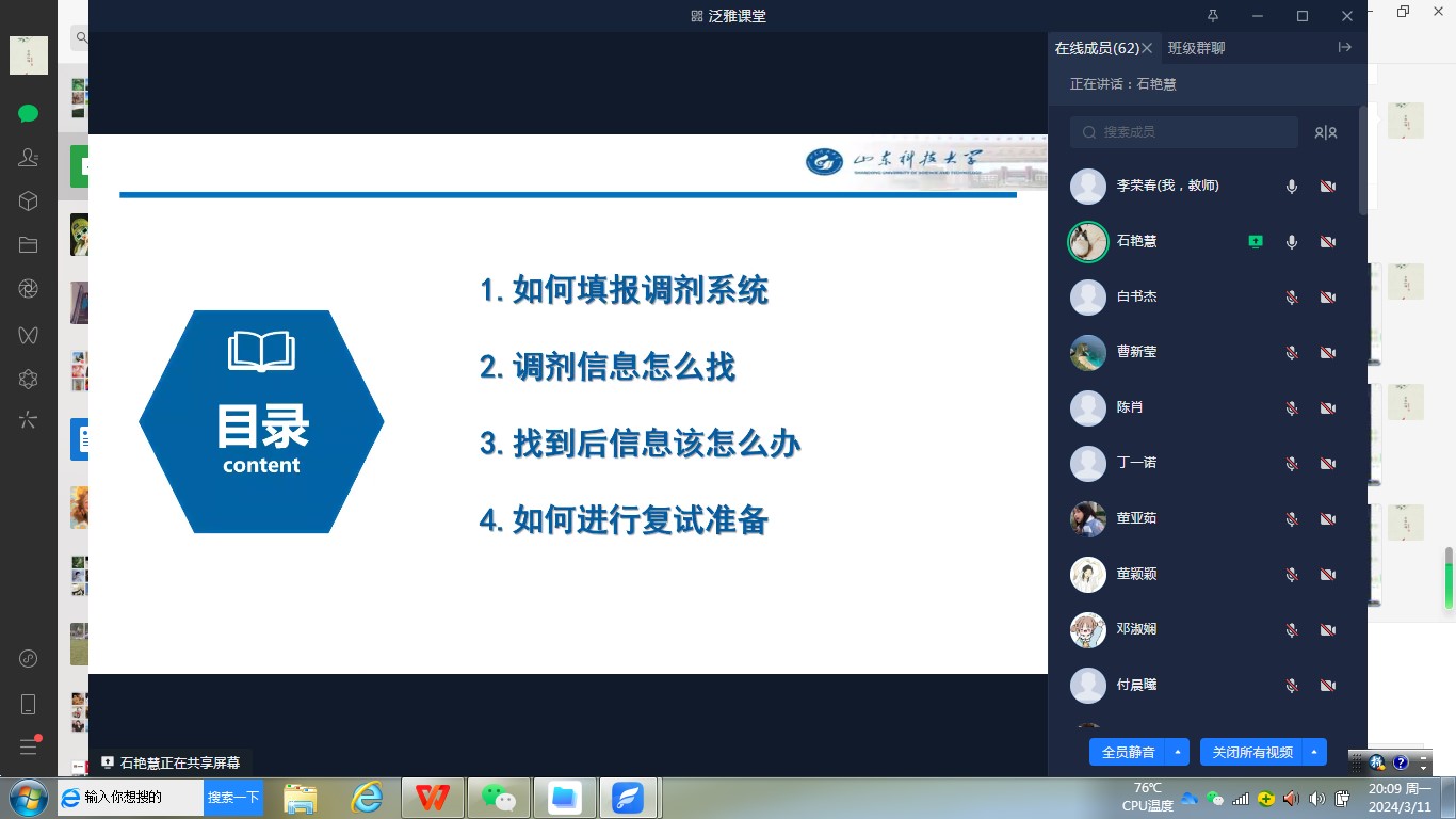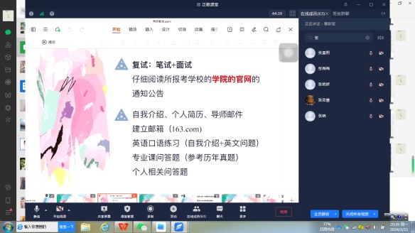 2024年3月11日,国产日韩欧美小视频在学校开学后,考研同学全面进入准备复试阶段,采用泛雅课堂形式再次举行考研复试/调剂经验交流暨指导会议。参加会议的有王新芳副院长、李荣春老师、受邀进行经验分享的我院2019级三位同学和我院2020级本科及2022级专升本班完成考研初试拟上国家线的同学。