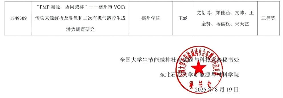 近日,“招行杯”第十八届全国大学生节能减排社会实践与科技竞赛决赛圆满落幕。我院刘文博老师指导的学生团队凭借作品《“PMF溯源,协同减排”—德州市VOCs污染来源解析及臭氧和二次有机气溶胶生成潜势调查研究》荣获全国三等奖。
