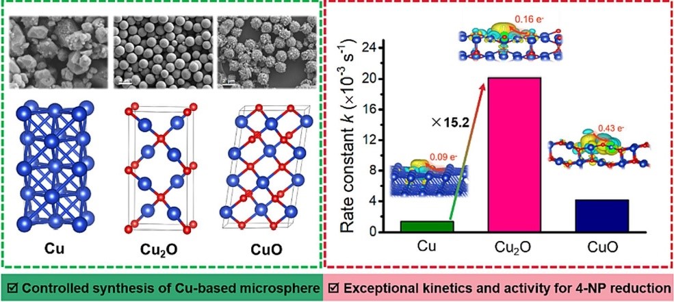 铜是催化加氢领域的重要元素,也是有望替代贵金属的核心元素之一。然而,铜基催化剂在温和条件下表现出较低的氧化还原性和表面能,从而限制了其电子转移能力和氢物种活化。该成果以催化剂晶相调控为主线,将实验研究与理论模拟相结合,开展了铜基催化剂的理化性能和催化特性调控。结果表明,与金属Cu以及CuO催化剂相比,球形的Cu2O表现出更强的氢活化能力、更优的催化加氢活性以及出色的可重复使用性。对于芳香硝基化合物加氢反应,Cu2O在2.5分钟内实现底物完全转化,反应速率常数(k)达到20.15 × 10-3s-1,该值是CuO和Cu催化剂的4.8倍和15.2倍。实验和理论计算表明,Cu2O独特的反荧石晶相结构和Cu+位点有利于活性H物种的吸附,此外独特的d-s轨道重组提供了更多电子,从而提高了其催化加氢性能。该研究成果将为金属催化剂晶相调控研究提供借鉴,有助于推进精细化工生产和污染处理工艺升级。