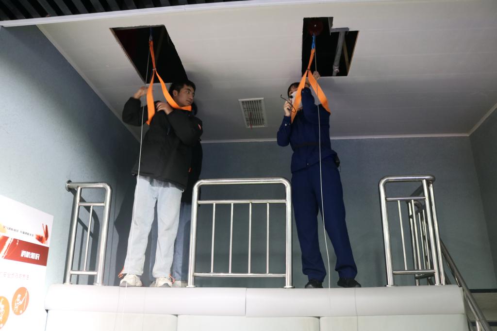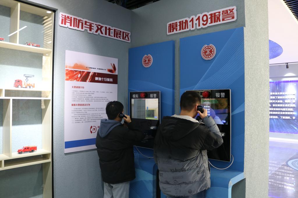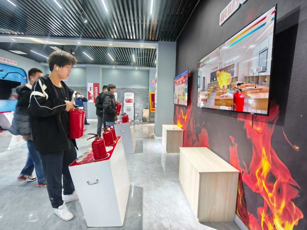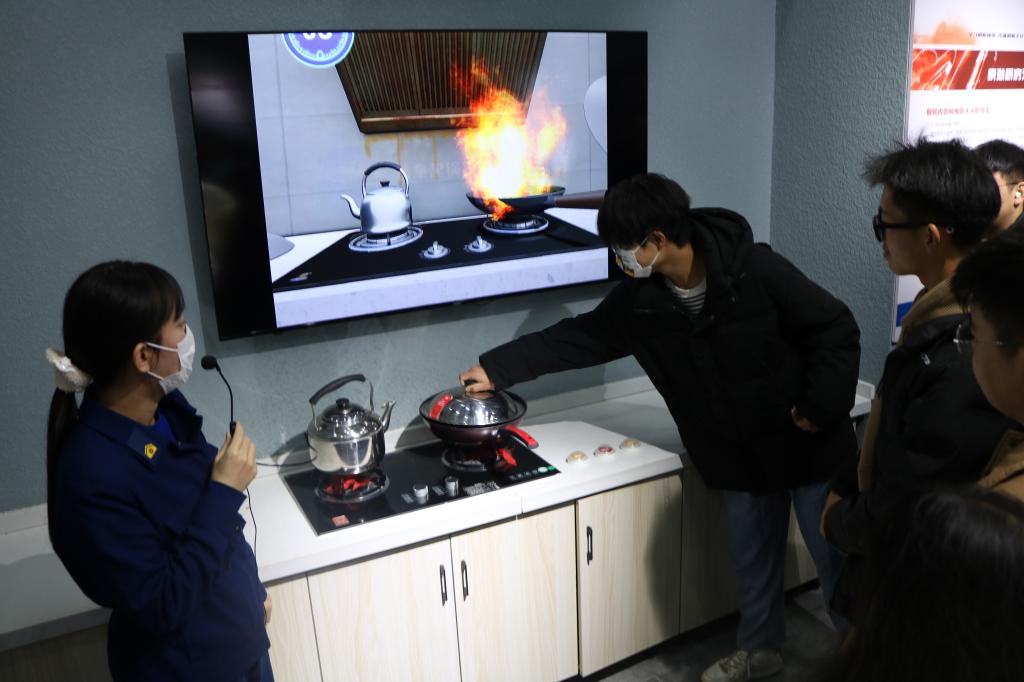 活动现场,讲解员通过实物展示、视频介绍、多媒体互动体验等科技手段,真实还原了客厅、厨房和电动车等火灾隐患场景,多角度讲解防火、灭火基本常识和消防器材使用方法等内容。在讲解员的指导下,学生依次体验了 119报警、安全绳逃生、模拟厨房灭火、地震逃生、电梯速降逃生,现场检验消防安全知识掌握程度。