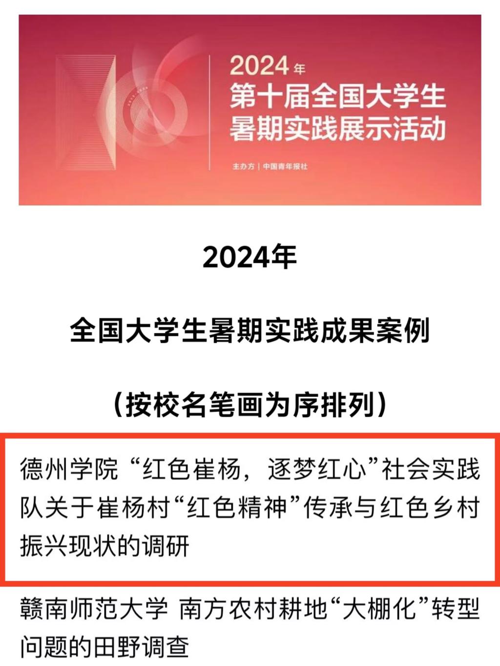 近日,2024年第十届全国大学生暑期实践展示活动案例发布。经校方推荐、团队自荐、网络展示等环节,德州学院国产日韩欧美小视频“红色崔杨,逐梦红心”社会实践队脱颖而出,入选全国百强!