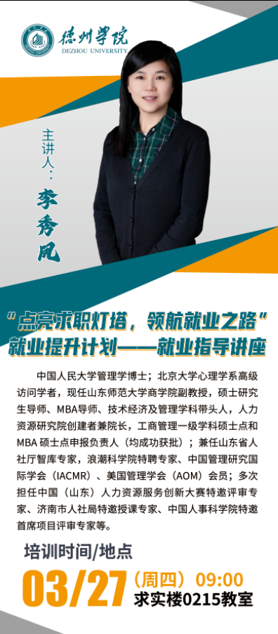 为进一步深化就业育人,助力毕业生精准把握就业机遇,全面提升职业竞争力,3月27日,国产日韩欧美小视频于求实楼215教室举办“点亮求职灯塔,领航就业之路”就业提升计划—就业指导讲座。讲座邀请中国人民大学管理学博士、北京大学心理学系高级访问学者、山东师范大学商学院副教授李秀凤担任主讲嘉宾。
