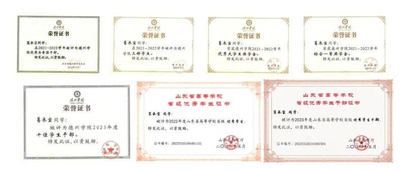 连续两学年学业成绩与综测成绩均位列专业第一名。曾获“2021-2022”学年国家奖学金、“2022-2023”学年国家奖学金、“2023-2024”学年国家奖学金、山东省优秀学生干部、山东省优秀学生、德州学院优秀大学生奖学金、综合一等奖学金、综合二等奖学金、十佳大学生、十佳学生干部、优秀学生干部、优秀共青团干部、三好学生等荣誉。