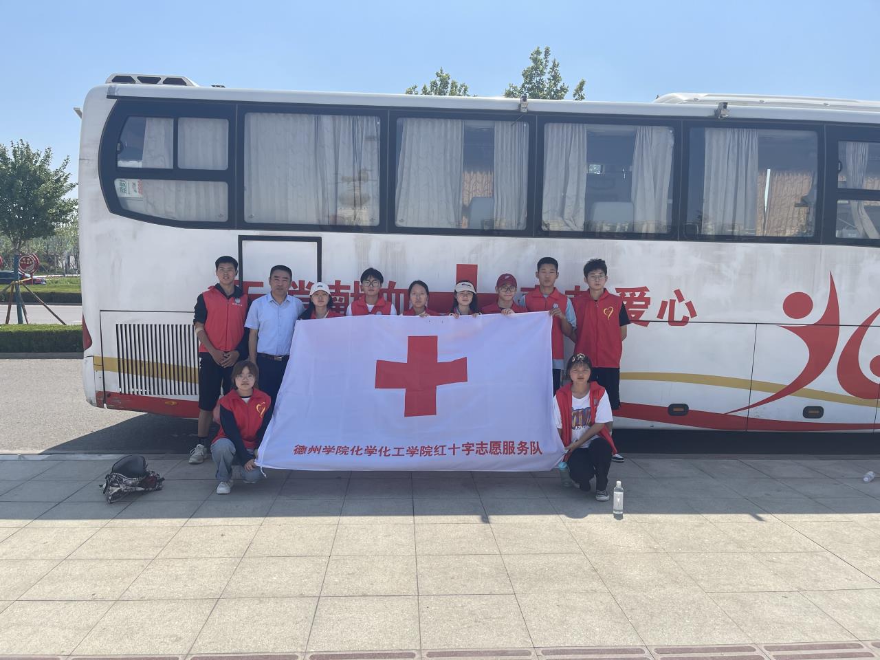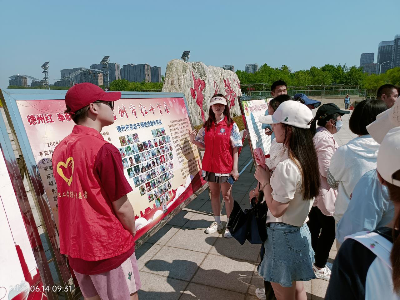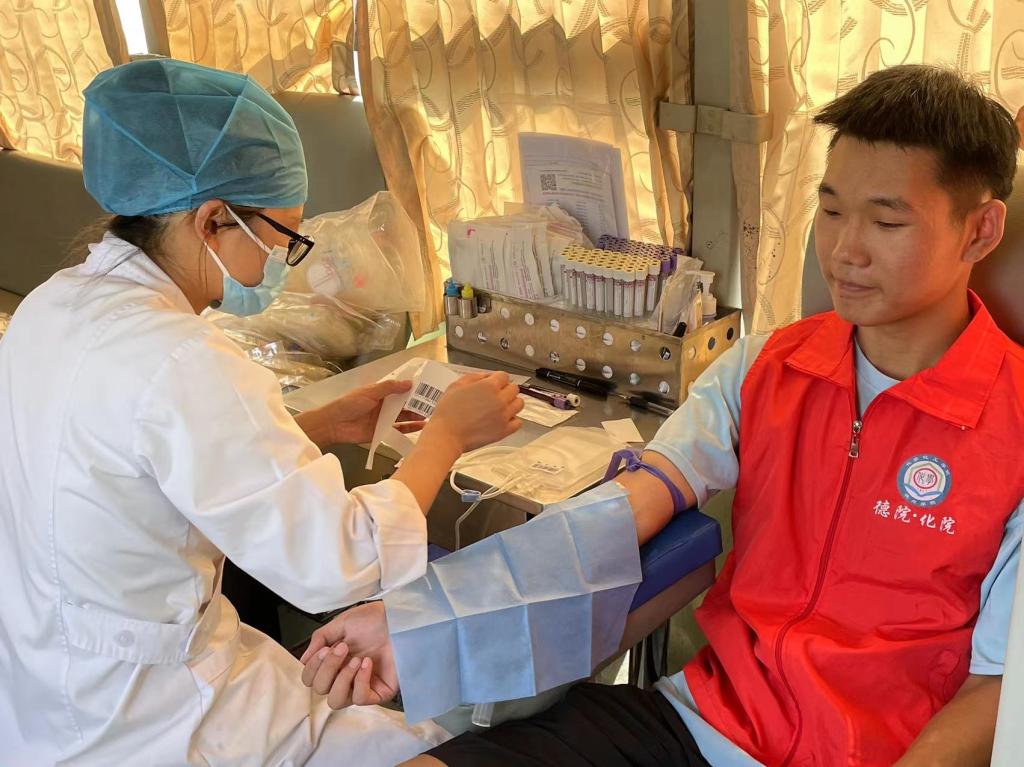 烈日下,志愿者们布置好献血现场,摆放好宣传展板和活动海报,热情地发放无偿献血和造血干细胞捐献科普知识宣传材料,并在现场讲解无偿献血和造血干细胞捐献的知识,动员更多爱心人士加入到无偿献血队伍中来。志愿者们为无偿献血者提供服务,配合医生有条不紊开展献血活动,协助医生的准备工作,引领合格的无偿献血者在献血车前排好队,同时部分志愿者同学也参与了此次无偿献血,将志愿精神内化于心、外化于行,奉献青春热血。