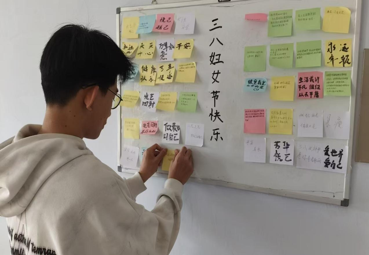 活动以“巾帼力量”为主线展开。开场环节重温了国际妇女节的百年历程,并回顾了张桂梅、屠呦呦等杰出女性的卓越贡献。随后的“巾帼故事”分享会上,同学们踊跃讲述身边女性榜样,朴素的故事中传递出温暖与力量。在“书写暖意”环节,参与者将饱含真挚情感的祝福写在便签上,寄语女性亲友、师长或未来的自己,五彩的便签汇聚成一面“暖心墙”,为现场增添浓厚温情。